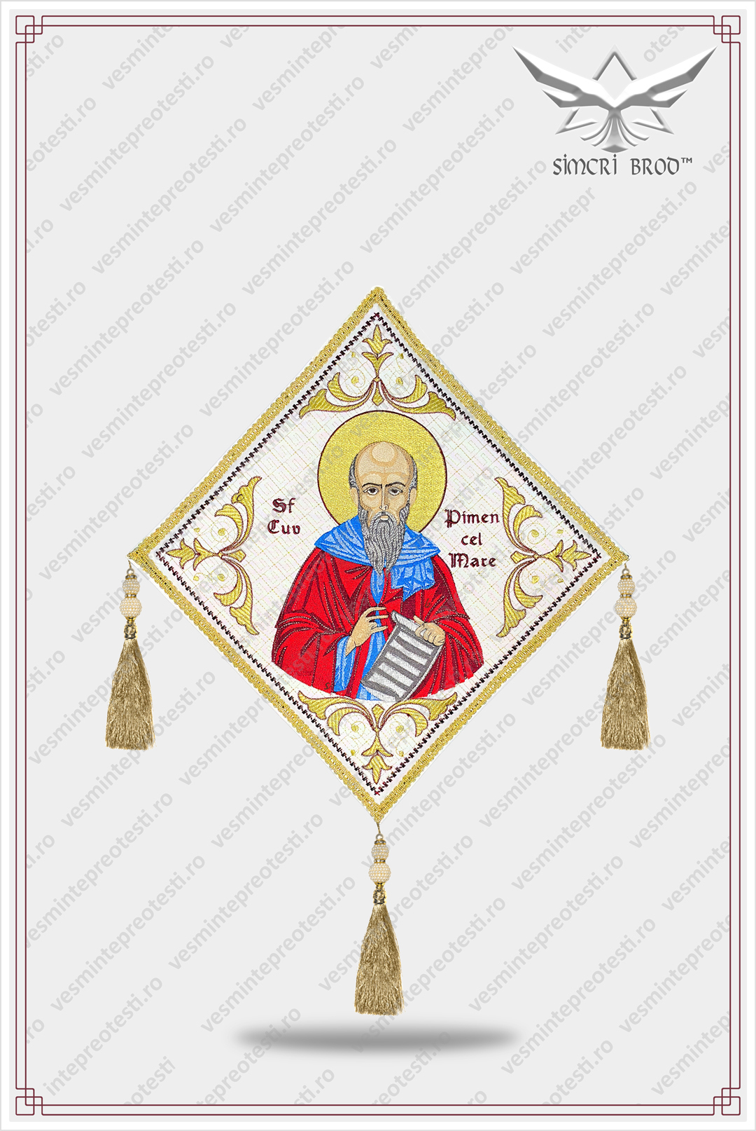 Bedernita brodata cu Sf Pimen cel Mare este o piesa liturgica de inalta tinuta, creata cu maiestrie pentru a imbina frumusetea artei sacre cu calitatea exceptionala a executiei manuale. Chipul sfantului este reprodus cu fidelitate prin broderie realizata exclusiv cu fire fine de matase, imbogatite cu fir metalic auriu, pentru a oferi profunzime, stralucire si eleganta fiecarei detalii.